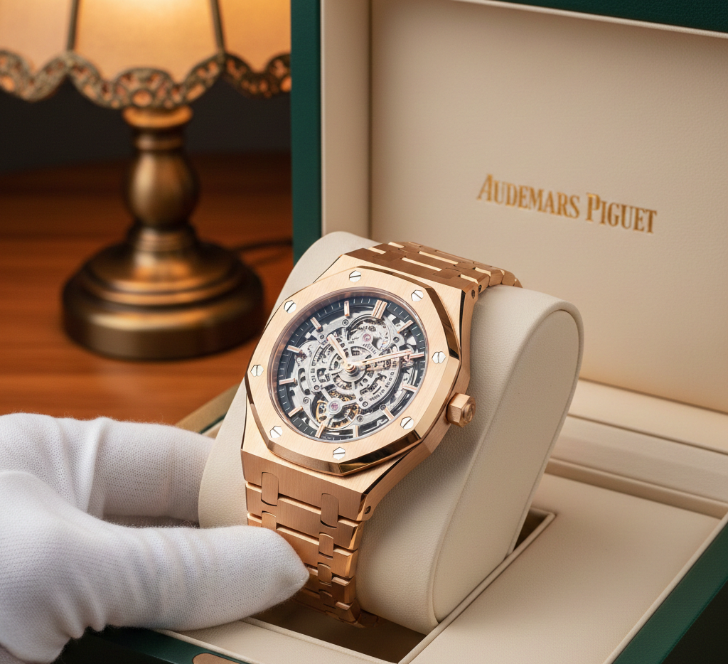 This design features a luxury skeletonized sports watch , characterized by its iconic octagonal bezel secured by eight hexagonal screws. The "openworked" dial eliminates a traditional face to showcase the intricate mechanical movement and gears within, creating a high-tech, architectural aesthetic. Its signature integrated bracelet flows seamlessly from the case, utilizing a mix of brushed and polished finishes to emphasize the bold, geometric silhouette.